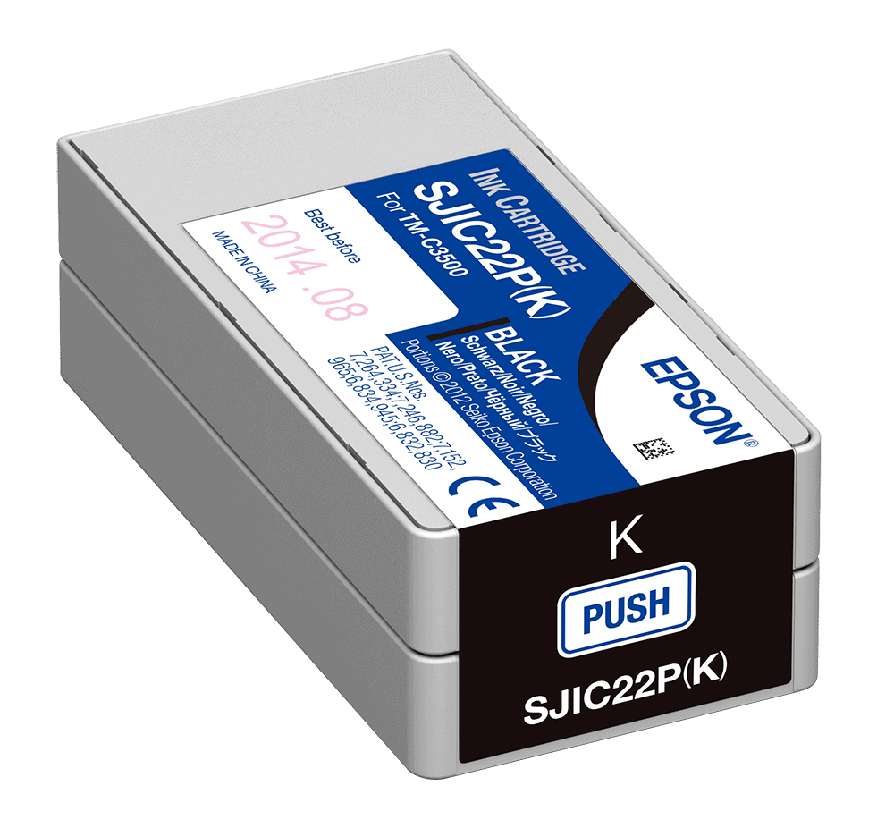 Epson ColorWorks C3500 Black Ink Cartridge (part # C33S020577, GJIC22P(B), GJIC22P(K), SJIC22P(B) or SJIC22P(K)) is for use in the Epson ColorWorks C3500 Label Printer.